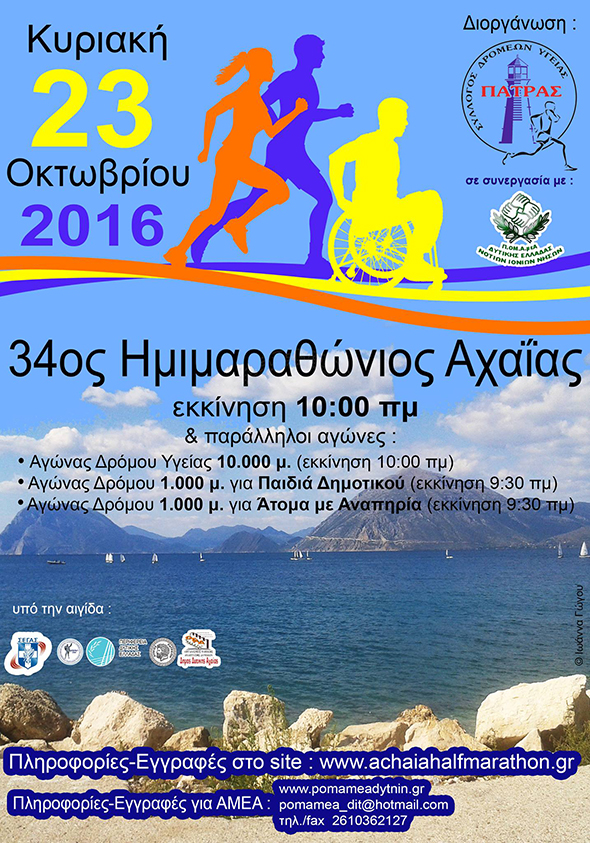 Ο Σύλλογος Δρομέων Υγείας Πάτρας βρίσκεται στην ευχάριστη θέση να ανακοινώσει τη διεξαγωγή του 34ου Ημιμαραθωνίου Αγώνα Δρόμου Αχαΐας 21,1χλμ την Κυριακή 23 Οκτωβρίου 2016, ώρα 10:00πμ.