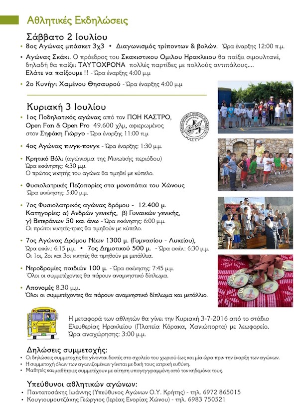 Ο Όμιλος Υπεραποστάσεων Κρήτης διοργανώνει την Κυριακή 3 Ιουλίου αγώνα δρόμου με την ονομασία «7ος Φυσιολατρικός Αγώνας Δρόμου Μυλοπόταμου» 12,4 χλμ. Ακολουθεί το πρόγραμμα όλων των πολιτιστικών και αθλητικών εκδηλώσεων που γίνονται στον Χώνο Μυλοπόταμου.