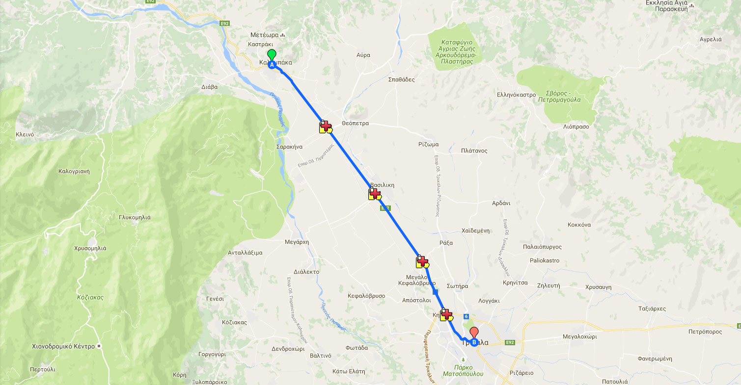 Ο αναλυτικός χάρτης, θα σας βοηθήσει να εντοπίσετε εύκολα τα κυριότερα στοιχεία της διαδρομής του Ημιμαραθώνιου Καλαμπάκα–Τρίκαλα, μαζί με τα σημεία ανεφοδιασμού και πρώτων βοηθειών. Υπάρχουν σταθμοί υδροδοσίας και πρώτων βοηθειών κάθε 5 χιλιόμετρα (5χλμ, 10χλμ, 15χλμ και τερματισμό) καθώς και ένα επιπλέον στο 18,5χλμ.