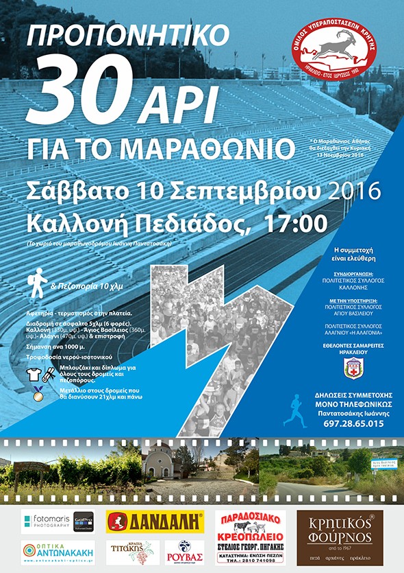 O Όμιλος Υπεραποστάσεων Κρήτης διοργανώνει το Σάββατο 10 Σεπτεμβρίου προπονητικό 30άρι για τους συμμετέχοντες του Αυθεντικού Μαραθώνιου της Αθήνας και Πεζοπορία 10 χλμ.