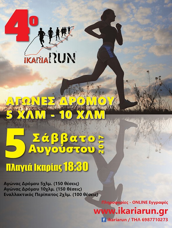 Το Σάββατο 5 Αυγούστου θα διαχθεί στην Ικαρία το 4o Ikaria Run 2017. Η διοργάνωση περιλαμβάνει αγώνες τρεξίματος 5 & 10 χλμ. αλλά και εναλλακτικό περίπατο 2 χλμ. στην Πλαγιά Ικαρίας με ώρα εκκίνησης στις 18:30.