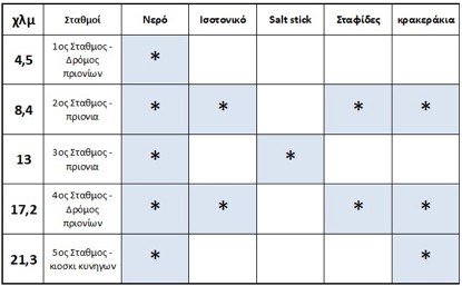 7. Τροφοδοσία: Στη διαδρομή θα υπάρχουν σταθμοί τροφοδοσίας: 1ος Σταθμός στο 4.5χλμ Νερά, 2ος Σταθμός στο 8,4χλμ. (νερό + ισοτονικά + σταφίδες, φρούτα, κρακεράκια), 3ος Σταθμός στο 13χλμ (νερό + salt stick), 4ος Σταθμός 17.2χλμ (νερό + ισοτονικά+ σταφίδες, φρούτα, κρακεράκια), 5ος Σταθμός στο 21,3χλμ (νερό + καραμέλες + κρακεράκια) και στον τερματισμό νερό
