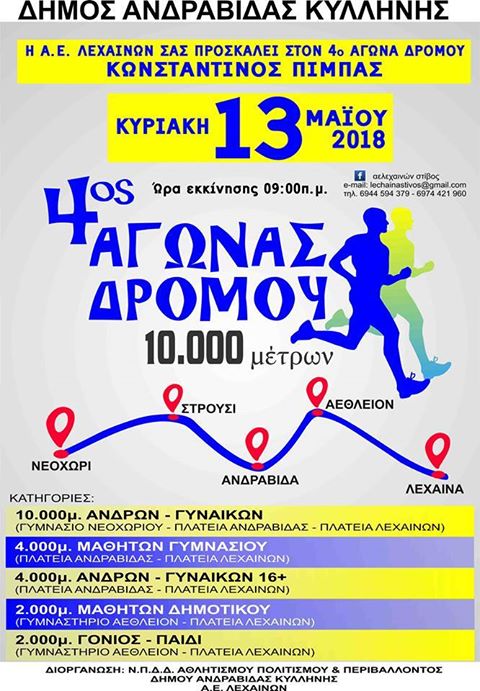 Την Κυριακή 13 Μαΐου η Α.Ε. Λεχαινών διοργανανώνει αγώνες δρόμου 10 & 4 χλμ. από το Νεοχώρα στα Λεχαινά με την ονομασία: 4ος Αγώνας Δρόμου Κωνσταντίνος Πίμπας. Παράλληλα θα διεξαχούν και αγώνες 2 χλμ. για μαθητές δημοτικού και «Γονιός-παιδί».