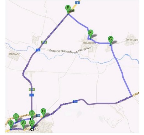 Εκκίνηση → Φάρσαλα, Πηγές Απιδανού ποταμού → οδός Θέτιδος προς Λαμία → οδός Λαμίας → Αρχαϊκός Θολωτός Τάφος → δεξιά οδός Αθηνών → οδός Λαρίσης, αριστερά προς Λάρισα (Πεδιάδα των Φαρσάλων – Σιδηροδρομική Γραμμή – Βασιλί – Γέφυρα Ενιπέα – Δενδράκια) → μετά το εργοστάσιο «ΕΠΙΛΕΚΤΟΣ» δεξιά προς Βαμβακού → Βαμβακού → Ρευματιά → Ρευματιά (τελευταίος δρόμος δεξιά) → οδός Βόλου – Φαρσάλων → οδός Βόλου – Φαρσάλων δεξιά προς Φάρσαλα → Φάρσαλα, οδός Βόλου → οδός Θέτιδος δεξιά → οδός Λαρίσης αριστερά → Τερματισμός Πλατεία Δημαρχείου – Άγαλμα Αχιλλέα.