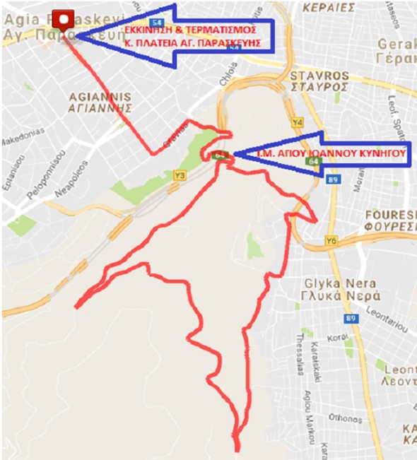 Ώρα εκκίνησης 08:30 π.μ.Αφετηρία Πλατεία Αγίας Παρασκευής (ΥΨ. 219 μ)- Αγ. Ιωάννου έως Κολλέγιο 1,2 χλμ – αριστερά Γραβιάς μέχρι διασταύρωση ΣΔΑΜ 500 μ. (ΥΨ. 260 μ.) στροφή δεξιά (παρατεταμένη ανηφόρα) προς Ι. Μ. Αγ. Ιωάννου Κυνηγού 1,2 χλμ (ΥΨ.345μ ) και μέχρι διασταύρωση με άσφαλτο 1,8 χλμ., στροφή αριστερά 350μ. προς κορυφή (ΥΨ. 415 μ.) (χωμάτινη ανηφορική διαδρομή) 700μ. (ΥΨ.ΜΑΧ. 460μ.) οριζόντια και κατηφορική διαδρομή 2,2 χλμ, (ΥΨ.350μ. )- τάπητας χρονομέτρησης – στροφή αριστερά 350 μοιρών (δασικός κατήφορος) 400μ. διακλάδωση αριστερά απότομη κατηφόρα 600μ, φτάνουμε σε διασταύρωση με άσφαλτο (οδός Αγάπης) 500 μ. δεξιά (οδός Κολοκοτρώνη), τέρμα Κολοκοτρώνη δεξιά (οδός Αγ. Ιωάννη) μέχρι την εκκλησία Αγ. Σάββας 1 χλμ (ΥΨ. 230μ.), απότομη ανηφόρα αριστερά μέχρι Ι. Μ. Αγ. Ιωάννη Κυνηγού 1 χλμ και δεξιά επιστροφή έως τερματισμό – αφετηρία 3 χλμ