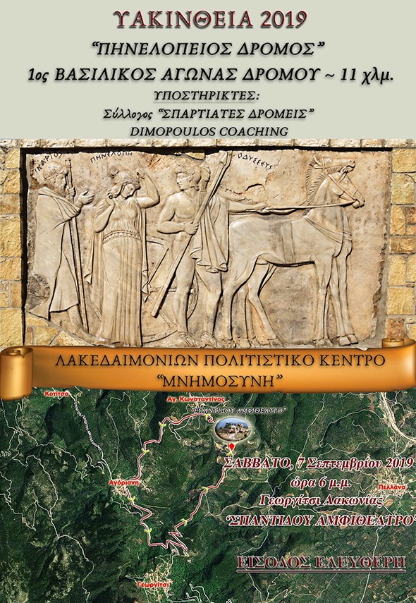 «Tο ΛΑΚΕΔΑΙΜΟΝΙΩΝ ΠΟΛΙΤΙΣΤΙΚΟ ΚΕΝΤΡΟ ΄΄ΜΝΗΜΟΣΥΝΗ΄΄ με την υποστήριξη των Σπαρτιατών Δρομέων και του Dimopoulos coaching, μέσα στα πλαίσια των ΥΑΚΙΝΘΕΙΩΝ 2019, διοργανώνουν τον 1ο ΒΑΣΙΛΙΚΟ ΑΓΩΝΑ ΔΡΟΜΟΥ 11χλμ., με την ονομασία ΠΗΝΕΛΟΠΕΙΟΣ ΔΡΟΜΟΣ