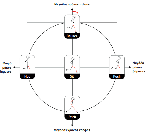 Στον κάθετο άξονα από πάνω προς τα κάτω βρίσκονται το Bounce και το Stick καθώς κατηγοριοποιούνται με βάση τον χρόνο πτήσης (μεγάλο χρόνο πτήσης το Bounce και μικρό χρόνο πτήσης το Stick). Στο κέντρο, το μοντέλο Sit ακολουθεί τις μέσες τιμές τόσο σε μήκος βήματος όσο και σε χρόνο πτήσης.