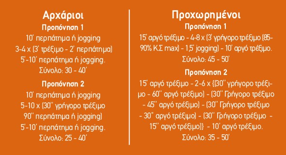 Στη συνέχεια ακολουθούν τέσσερις προτάσεις για fartlek, δύο για νέους και δύο για πιο έμπειρους δρομείς με την προϋπόθεση ότι διαθέτετε χρονόμετρο. Σε αντίθετη περίπτωση αξιοποιήστε τις δυνατότητες που σας προσφέρει ο περιβάλλον χώρος, θέτοντας στόχους στη διαδρομή που τρέχετε. Για παράδειγμα αφού έχετε ολοκληρώσει την προθέρμανσή σας τρέξτε πιο έντονα μέχρι το επόμενο παγκάκι, κολώνα της ΔΕΗ ή δέντρο που θα συναντήσετε, χαλαρώστε το τρέξιμο σας μέχρι την επόμενη στροφή, ανοίξτε και πάλι ρυθμό μέχρι να προσπεράσετε τον δρομέα που βρίσκεται στα 80 μέτρα μπροστά σας, ακολουθήστε τον μέχρι να πέσουν λίγο οι σφυγμοί σας, κ.ο.κ. Καλή διασκέδαση!