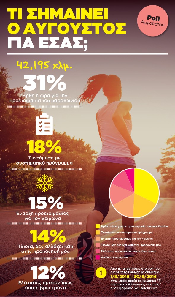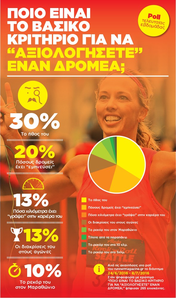 Έτσι, με χαρά διαπιστώσαμε ότι για την πλειοψηφία των δρομέων που συμμετείχαν στα poll, το ήθος είναι το βασικό κριτήριο για την αξιολόγηση ενός δρομέα. Ακόμα, επιβεβαιώσαμε την υποψία μας ότι για τους περισσότερους ο Αύγουστος σημαίνει την έναρξη της προετοιμασίας για έναν μαραθώνιο ή ότι περισσότεροι θεατές στο Καλλιμάρμαρο Στάδιο ή στη διαδρομή του 34ου Μαραθώνιου της Αθήνας θα έδιναν «φτερά» στα πόδια των συμμετεχόντων κ.ά.