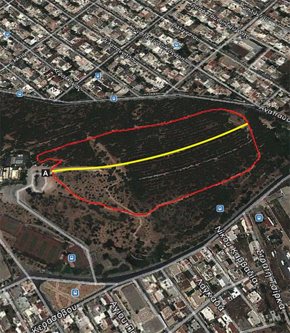 Μέσα στο πάρκο ο καθένας μπορεί να σχηματίσει αρκετές διαδρομές, αφού υπάρχουν κάποιοι δρόμοι οι οποίοι είναι καλοστρωμένοι ενώ καλύπτονται στο μεγαλύτερο μήκος τους από ψηλά πεύκα που κρύβουν τις αχτίδες του ήλιου. Ξεκινώντας λοιπόν από το πάρκινγκ (Α), όπου βρίσκονται οι καφετέριες, κι ακολουθώντας τον περιμετρικό δρόμο του πάρκου από την ανατολική πλευρά, συνεχίστε μέχρι την κορυφή του και στη συνέχεια, πάνω στον ίδιο δρόμο, κατηφορίστε στη δυτική πλευρά του πάρκου. Στη συνέχεια, όταν φτάσετε στο ύψος των καφετεριών, εκεί από όπου ξεκίνησε και η διαδρομή, στρίψτε αριστερά για να βρεθείτε στο αρχικό σημείο. Έτσι, θα συμπληρώσετε μία διαδρομή με συνολική απόσταση περίπου 850 μ. Όποιος επιθυμεί να τη μεγαλώσει μπορεί να εντάξει στη διαδρομή τον κίτρινο δρόμο (χάρτης), ο οποίος έχει μήκος 330 μ., αυξάνοντας το συνολικό της μήκος. Τέλος, υπάρχει η δυνατότητα να εκτελέσετε προπονήσεις με κλίση στους ανηφορικούς δρόμους του άλσους που μπορούν να φτάσουν και τα 500 μ. σε μήκος.