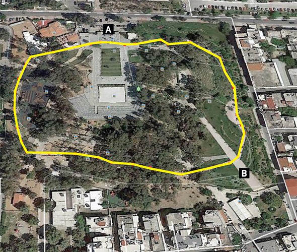 Το πάρκο διαθέτει ένα περιφερειακό, εντελώς επίπεδο μονοπάτι το οποίο έχει μήκος 600 μ. ενώ περνά από αρκετά όμορφα σημεία. Επιπρόσθετα μπορείτε να χρησιμοποιήσετε τα σκαλοπάτια του θεάτρου που βρίσκεται στο κέντρο για την εκτέλεση ασκήσεων αλλά και ξέφωτα (σημείο Β) όπου μπορείτε να κάνετε ασκήσεις ή ανοίγματα.