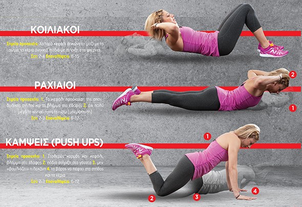 Καλό είναι να ολοκληρωθεί με κοιλιακούς, ραχιαίους και κάμψεις (push ups) για ολοκληρωμένη ενδυνάμωση του κορμού