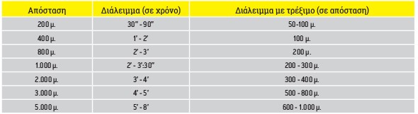 Στον πίνακα που ακολουθεί θα δείτε τις προτεινόμενες διάρκειες της ξεκούρασης, είτε με χρόνο είτε με απόσταση (χαλαρό ή πιο γρήγορο τρέξιμο), στις διαλειμματικές προπονήσεις για αποστάσεις από 200 ως 5.000 μ.