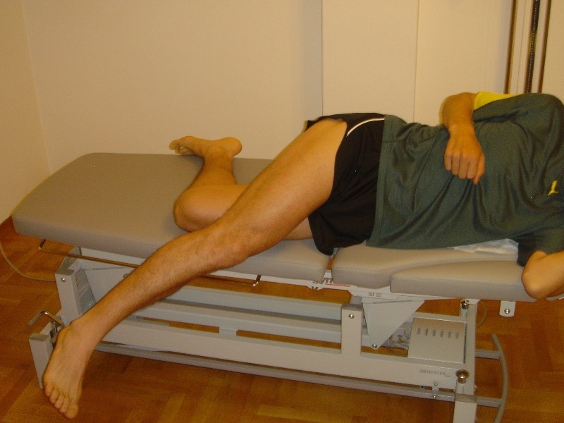 1. Ο αθλητής είναι ξαπλωμένος σ’ένα κρεβάτι σε πλάγια κατάκλιση. Το κάτω πόδι (υγιές) λυγισμένο. Το πάνω πόδι (πάσχον) μπροστά και έξω από το κρεβάτι με το γόνατο τεντωμένο. (βλ. σχήμα 1α) Από αυτή την θέση σηκώνει λίγο και κρατά το πάνω πόδι για 6-10 δευτερόλεπτα και μετά το αφήνει κάτω να χαλαρώσει. (βλ. σχήμα 1β) Το επαναλαμβάνει 3 φορές.